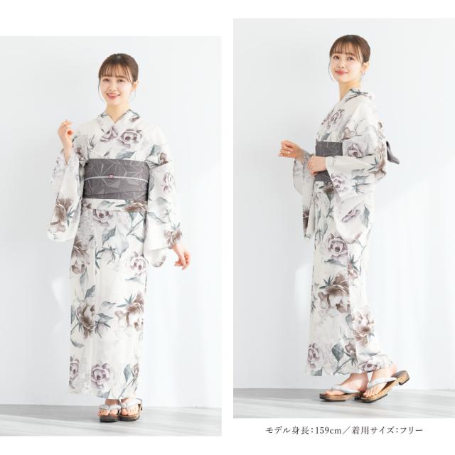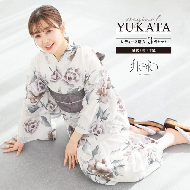 浴衣 セット レディース 浴衣セット 半幅帯 2025 floro 簡単 涼しい コーディネート済み 吸水速乾 白 紫 グレー ニュアンスカラー おしゃれ 可愛い 下駄 S フリー 送料無料