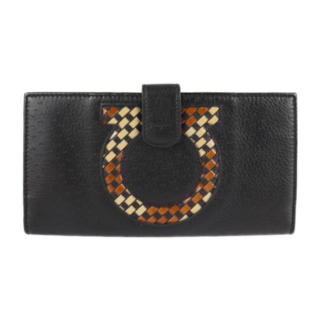 美品 Salvatore Ferragamo サルヴァトーレ フェラガモ ガンチーニ 長財布 22 7221 レザー ブラック 編み込み柄 二つ折り財布【本物保証】