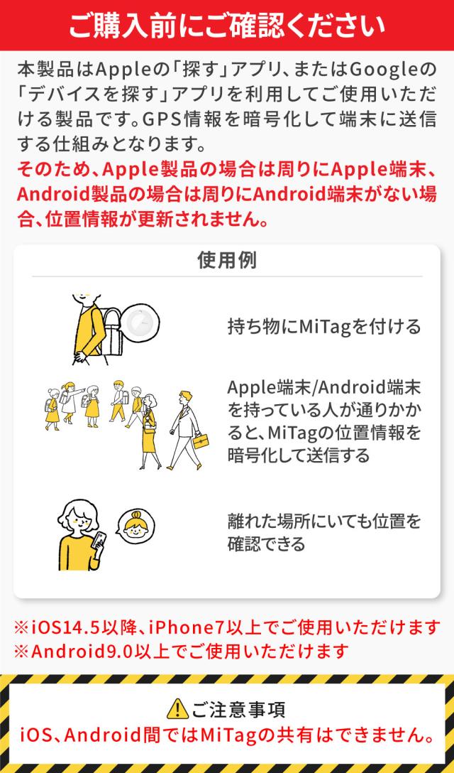 | ご注意事項 | ・iOS、Android間ではMiTagの共有はできません。 ・Googleの「Find Hub(デバイスを探す)」アプリは名称が変更になる場合がございます。 ・タグと接続したAndroid端末が近くにない場合、タグの周りに3台以上のAndroid端末があることで位置情報がリアルタイム更新されます。 ・Googleの「デバイスを探す」の設定は、デフォルトでは「トラフィックの多いエリアでのみネットワークを使用」の設定が有効になっております。 この場合、デバイスの位置を検出するためには、その付近に“複数の”Androidデバイスがなければなりません。 もしさらに精度を上げたい場合は、Androidの「設定>セキュリティおよびプライバシー>紛失したデバイスを保護>オフライン検出」をONにすることで「すべてのエリアでネットワークを使用」に変更することも可能です。 この設定を有効にすると、人通りが少ないエリアでAndroidデバイスが付近に“1台”あれば位置情報を確認することができます。 ※端末により本設定が存在しない場合がございます。 |