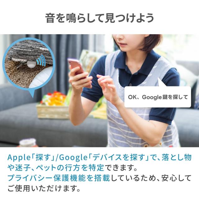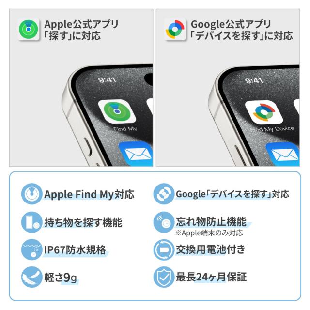 ■Appleの「探す」アプリに対応 iPhone、iPad、Macデバイスの「探す」ネットワークで、世界中どこでも、落とし物の位置を特定できます。 スマホから位置をチェックし、持ち物に近づいた時にスマホでMiTagを鳴らすと、アラートが鳴り位置を特定できます。 持ち物を置き忘れた場合も、持ち物から50m以上離れるとお手持ちのデバイスにバナーで通知が来ます。 【対応機種】IOS14.5 / iPadOS14.5 / macOS12.5以上 例)iPhone13 / iPhone13 mini / iPhone13 Pro / iPhone13 Pro Max / iPhone14/14Plus / iPhone14Pro / ProMax ■Googleの「デバイスを探す」に対応 Googleの「デバイスを探す」ネットワークで、落とし物や迷子、ペットの行方を特定できます。 プライバシー保護機能を搭載しているため、安心してご使用いただけます。 スマホから位置をチェックし、持ち物に近づいた時にスマホでタグを鳴らすと、アラートが鳴り位置を特定できます。 持ち物を置き忘れた場合も、持ち物から50m以上離れるとお手持ちのデバイスにバナーで通知が来ます。 【対応機種】Android9.0以上 ■複数のスマートタグを接続可能 複数のスマートタグを何台でもデバイスに追加できるため、家族分の鍵や防犯としてお子さまの持ち物につけるなどの使い方ができます。 また、一つのMiTagを複数のデバイスで共有することも可能です。 ■長寿命&電池交換可能 約365日の長時間バッテリーを使用。さらに、電池交換式のため長く愛用していただけます。嬉しい交換用電池付。 ■大音量ブザー搭載 大音量のブザーにより、クッションなどに隠れていても見つけ出すことができます。 ■技術基準適合証明(技適)取得済み 技術基準適合証明番号:R214-126021 本製品は日本での技術基準適合証明(技適)を取得しています。 技適証明を取得していない商品を日本国内で使用する場合、電波法違反になる恐れがございます。技適証明取得をしている製品のご購入、ご使用を推奨いたします。 ※製品やパッケージへの技適マーク記載は任意のため、本製品には記載がございません。技適証明取得をご確認されたい場合は、総務省 電波利用ホームページよりご確認ください。 |