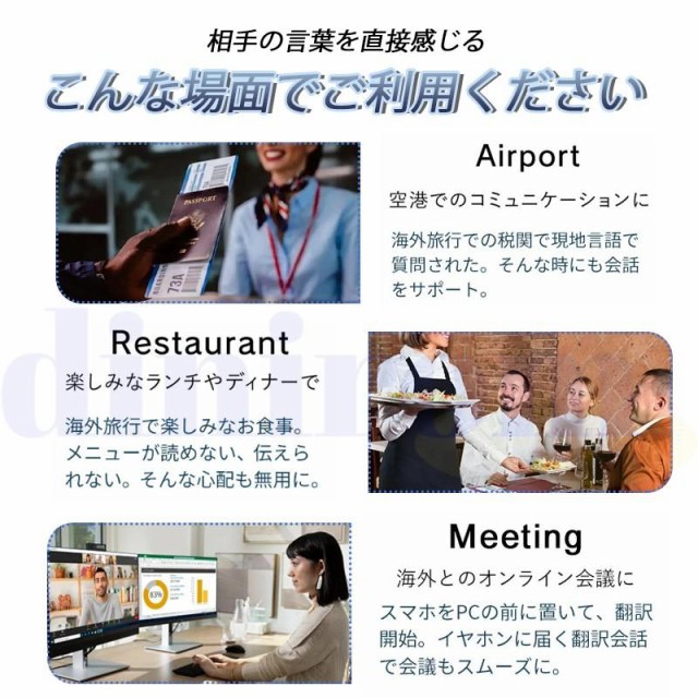 スマホとイヤホンをBluetoothで繋ぎ、専用アプリを開けばすぐに会話へ。ビジネスシーンでは、会議だけでなく、外国人スタッフを抱える企業では、詳細な指示出しやチームワークもより円滑に行えます。