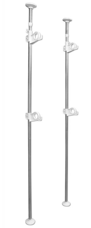 竿受けの高さは床から約184cmまでの間で自由に調節可能。内蔵バネで圧着固定。使用できる竿の直径3~4cm。小物掛けに便利なフック付き。