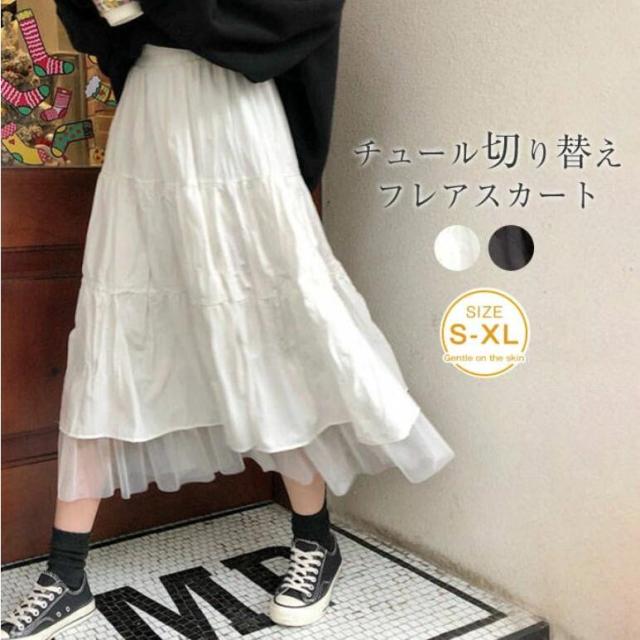 スカート フレアスカート レディース チュール切り替え サマースカート ロングスカート マキシ丈 ロング 無地 ウエストゴム ボトムス ふんわり
