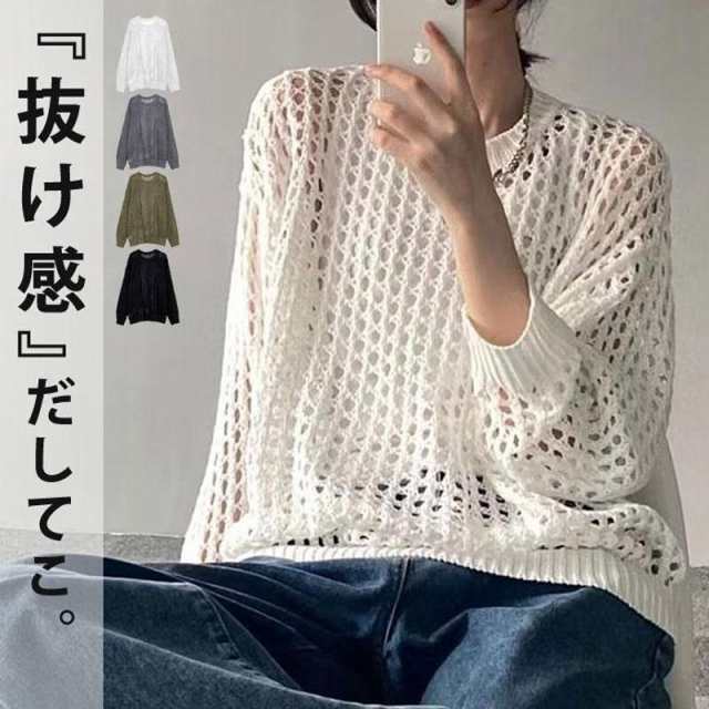 メッシュニット レディース 夏用 サマーニット 透かし編み 肌見せ 長袖 トップス 重ね着 レイヤード あみあみ 透け フィッシュネット か