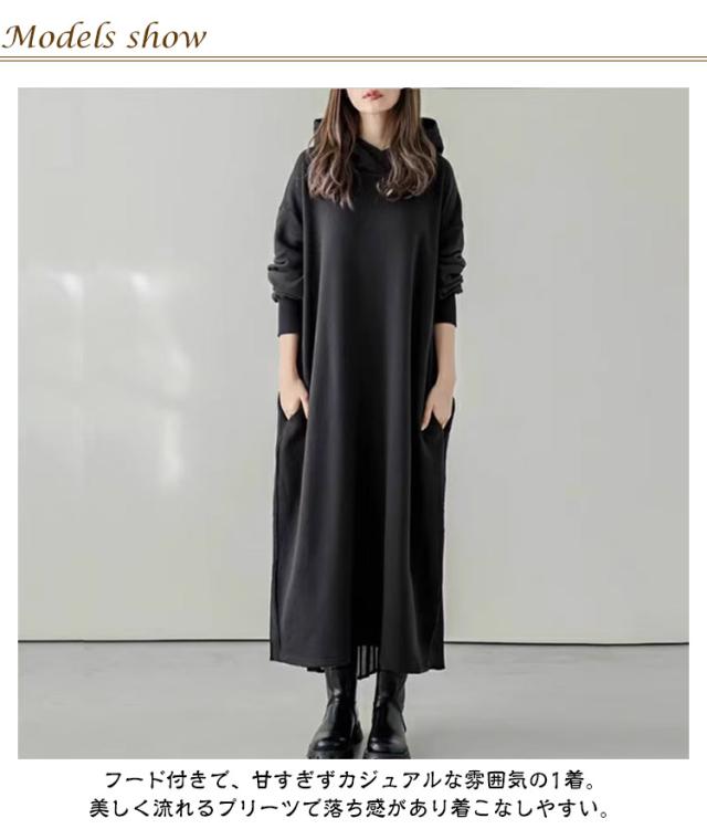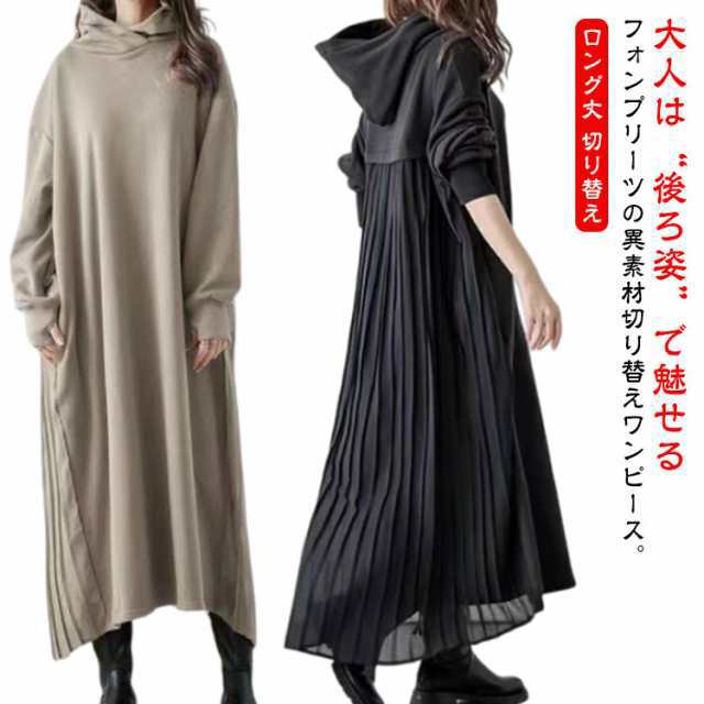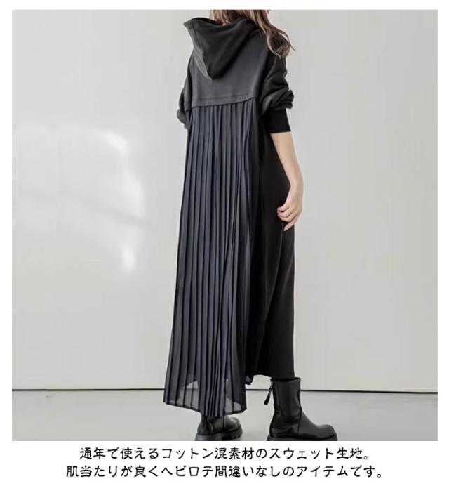 プリーツワンピース 切り替え シフォン ワンピース ロング フーディー マキシ レディース プリーツワンピース 異素材 長袖 春秋 スウェット トレーナー おしゃれ ロングワンピース ロンT Tシャツワンピ パーカー ワンピ プルオーバー カジュアル