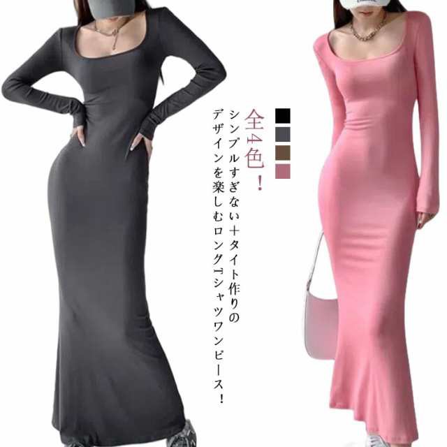ワンピース マキシ丈 マキシワンピース 無地 ロング丈 マキシワンピース スクエアネック タイト 長袖 マキシワンピ 細見え タイトワンピース デート 春 夏 秋