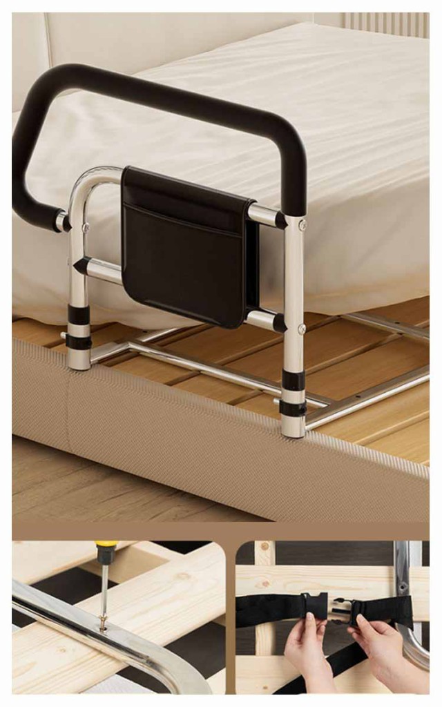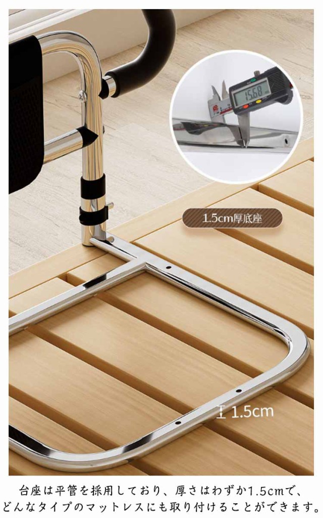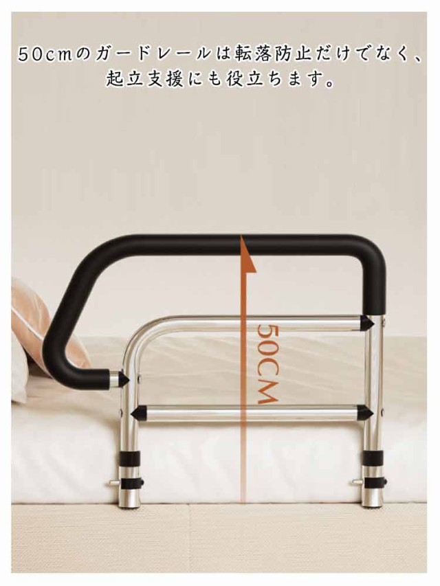 | 【ベッドサイドガード】【転落防止】【落下防止】 ベッドから起き上がるのに苦労している方にベッドへの出入りを支援するように設計されています。 50cmのガードレールは転落防止だけでなく、起立支援にも役立ちます。 マットレスの下に差し込むだけで、布団のずれ落ち・落下防止に役立ちます! 塗装された炭素鋼でできており、耐久性があり、強い耐荷重能力を持っています。 台座は平管を採用しており、厚さはわずか1.5cmで、どんなタイプのマットレスにも取り付けることができます。 手すりの部分は滑り止めゴムが付き、滑り止め効果がありながら、冬でも冷たさを感じにくく。 収納ポケットが装備され、携帯電話、薬、メガネ、本、リモコンなど様々な小物を収納するのに便利です。 また、ひざや腰に負担をかけずに立ち上がるための補助としてもご利用いただけます。 | |