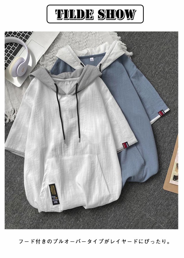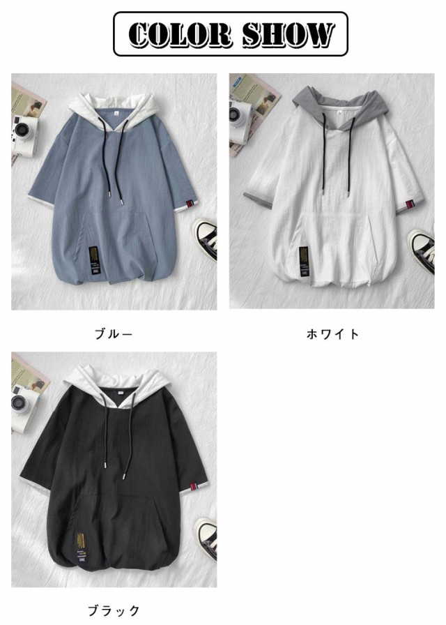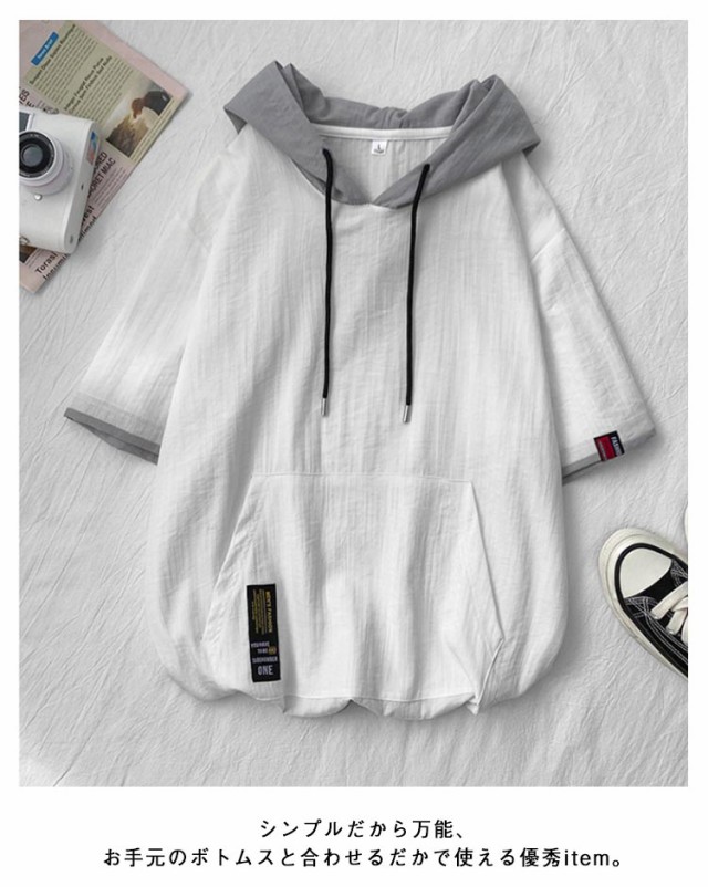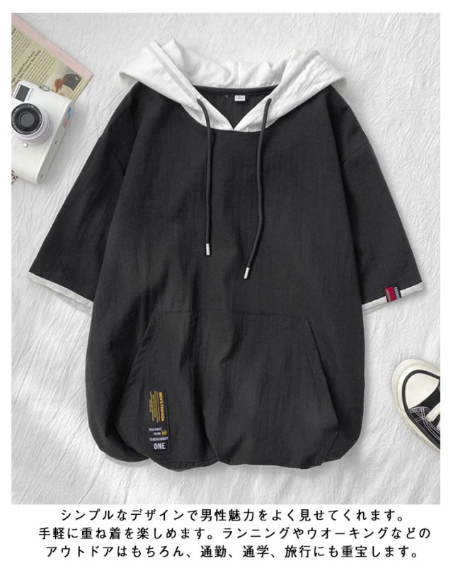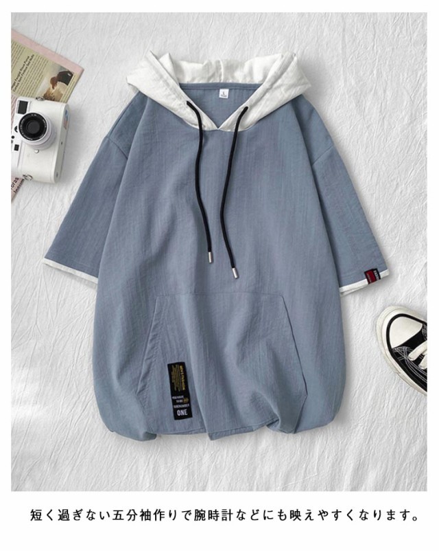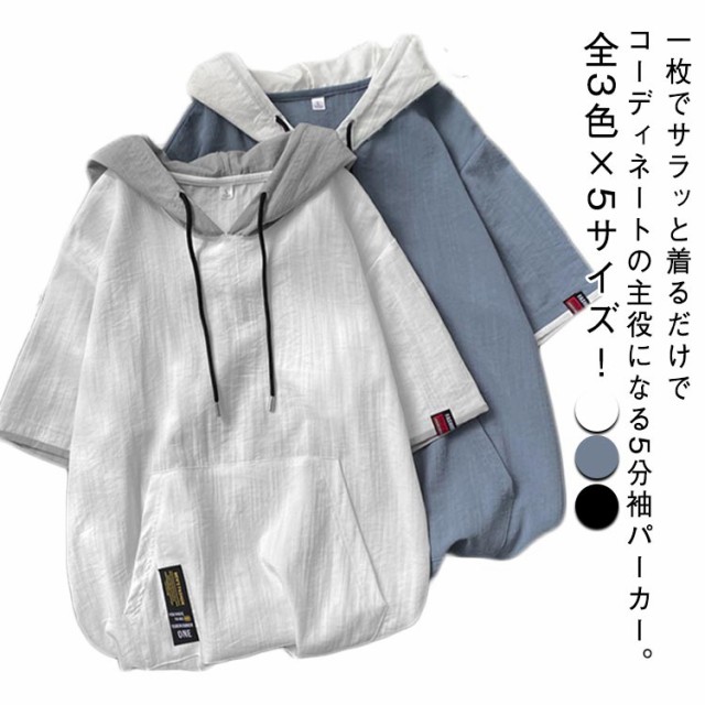 夏服 半袖 大きサイズ トップス フード付きTシャツ パーカー 夏 メンズ カジュアル 春 五分袖 全3色×5サイズ tシャツ 薄手 フード付きパーカー 無地 5分袖パーカー リラックス 全3色×5サイズ シンプル フード付き プルオーバー 春夏 涼しい 通勤 通学 おしゃれ