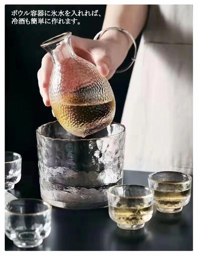 | おしゃれ 冷酒器7点セット 手作りならではの質感が◎ ガラスを採用し、外のボウル容器にお湯をを入れて、 やわらかで美味しい「ぬる燗」も作れます。冬で一杯で、身体が暖かくなります。 ボウル容器に氷水を入れれば、冷酒も簡単に作れます。 適量のお酒が楽しめるので、ちびちびと一人で呑むのに最適なサイズ。 | |