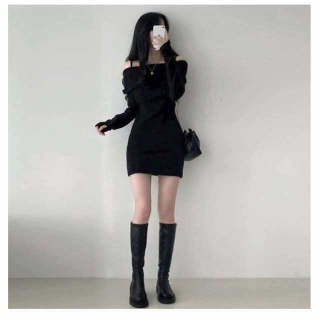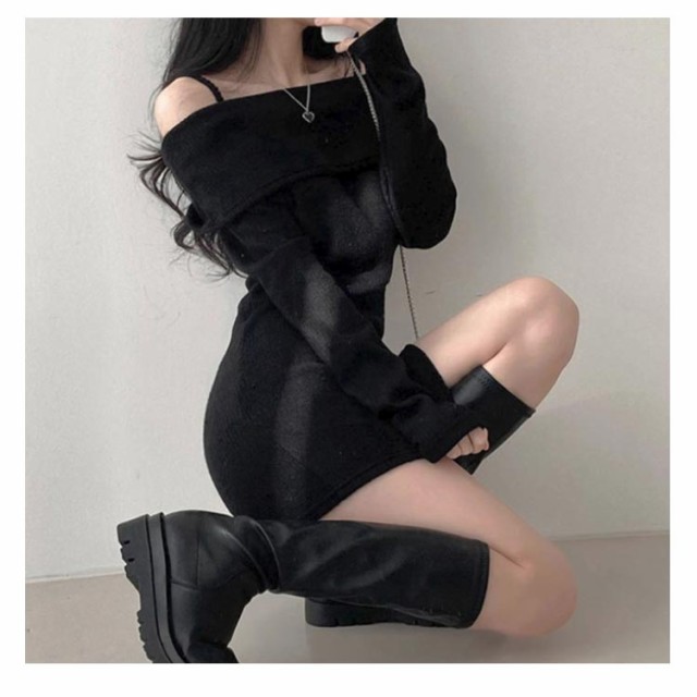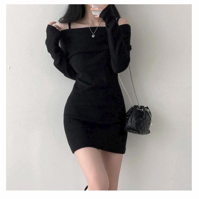長袖ワンピ ミニ セクシー チュニック丈 キャミワンピース オフショルダー オフショルダー ワンピース リブ ニットソー レディース 肩出し 肩紐付き ワンピース 長袖 ワンピース 春ワンピース 秋ワンピース 指穴付き