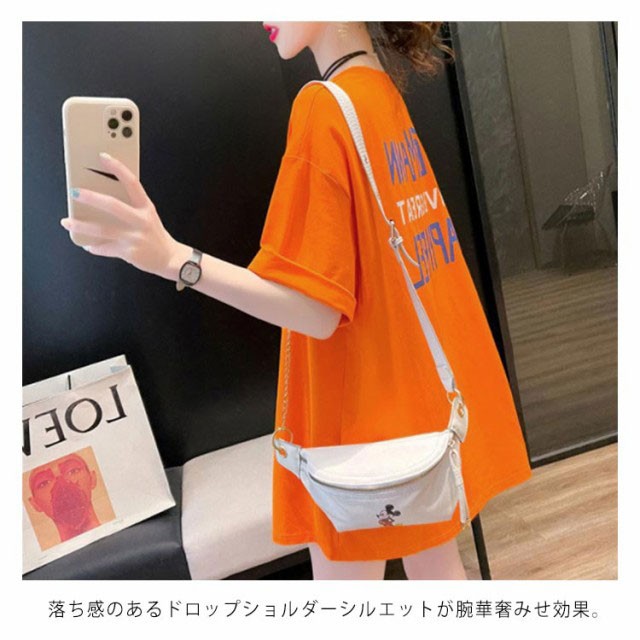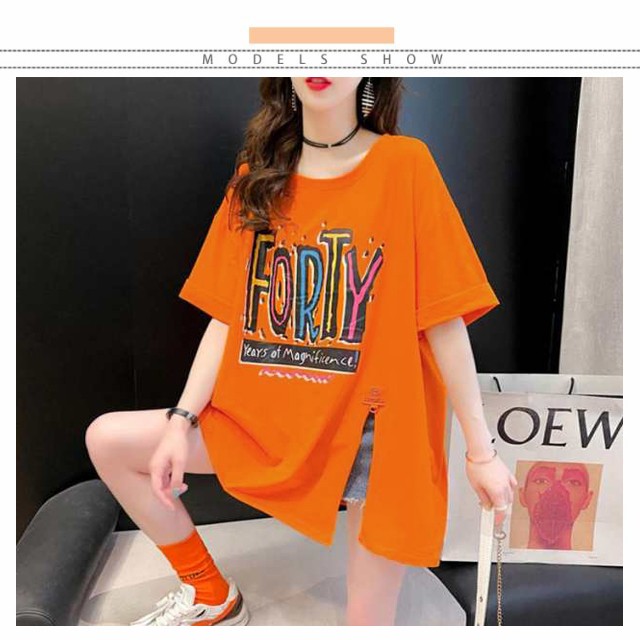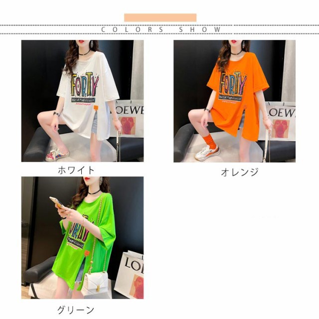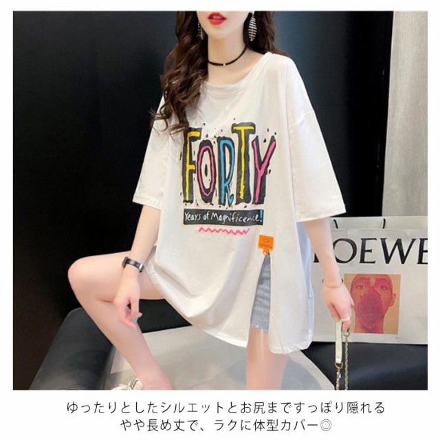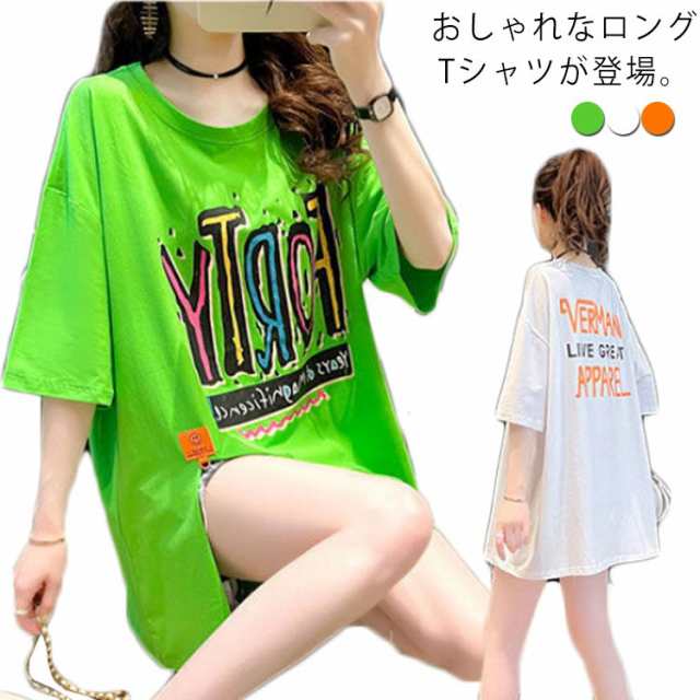 ロングtシャツ レディース 半袖 ゆる Tシャツ ロングT ドロップショルダー ロングティーシャツ 五分袖 クルーネック ダンス衣装 体型カバー 送料無料 ストリート系 スリット入り 英字 カジュアル 夏