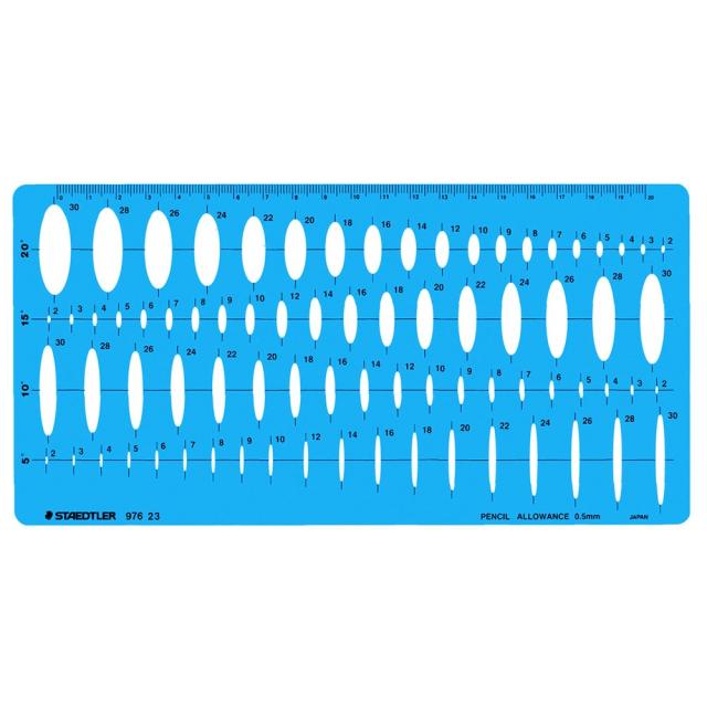 透明度が高いテンプレートのため図面も識別しやすいですまた、ブルーの本体色は目にもやさしく、長時間の作業にも適しています ペンなどを使用する際、にじみによる汚れを防止するインクエッジ付きです 0.5mmシャープペンシル用 【仕様】5° / 10° / 15° / 20°のだ円 76穴 日本製