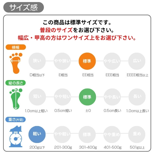 甲高、幅広の方→「ワンサイズ大きめ」