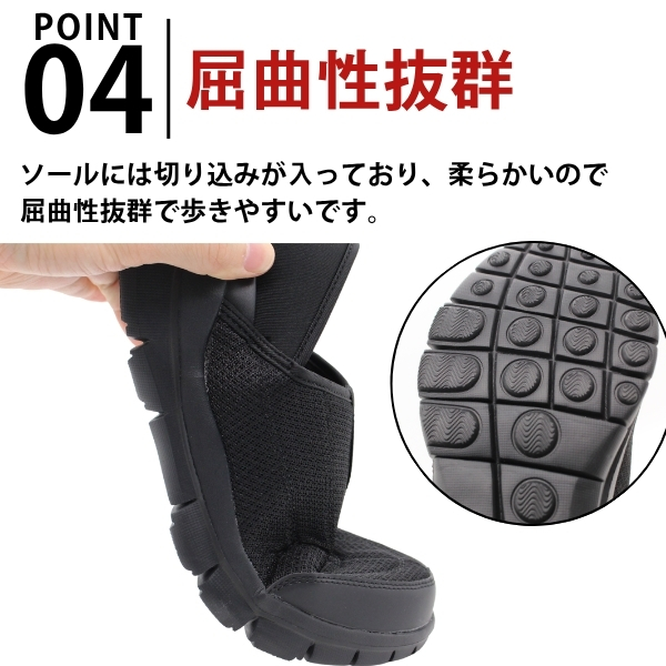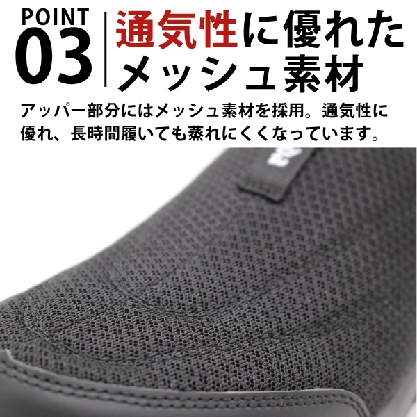アッパー部分にはメッシュ素材を採用。通気性に優れ、長時間履いても蒸れにくくなっています。