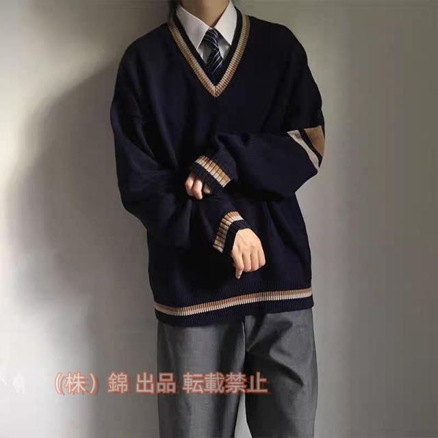 スクールセーター 男子 女子 ニッケ ライン入り ニットセーター 学生服 JK制服 DK制服 Vネック 紺 秋冬