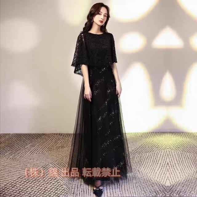 ロングドレス 黒 袖付き ワンショルダー ドレス ロング丈 ミモレ丈 大人 演奏会 ピアノ 発表会 母親錦結婚式 韓国風 ロング 大きいサイズ 4L 体型カバー