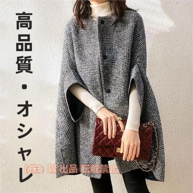 ポンチョ レディース 7分袖 マント ケープコート 秋冬 アウター 上品 ハウンドトゥース柄 高品質 ラウンドネック 株式会社錦通勤 柔らかい 40代 50代