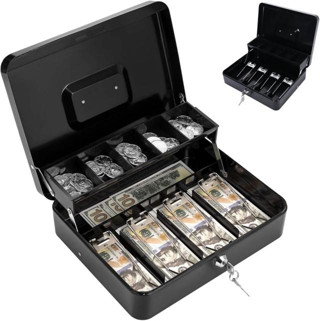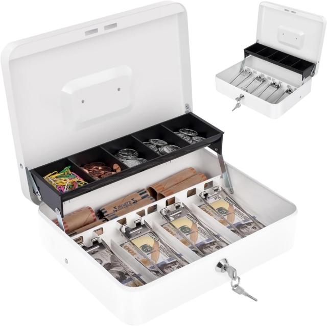 カンチレバーマネートレイ: キャッシュボックスが開くと、コイン用の5つのコンパートメントカンチレバートレイが自動的に開きます。金庫 家庭用の下には、追加の紙幣、メモ、領収書などを入れるための小さなコンパートメントがあります。