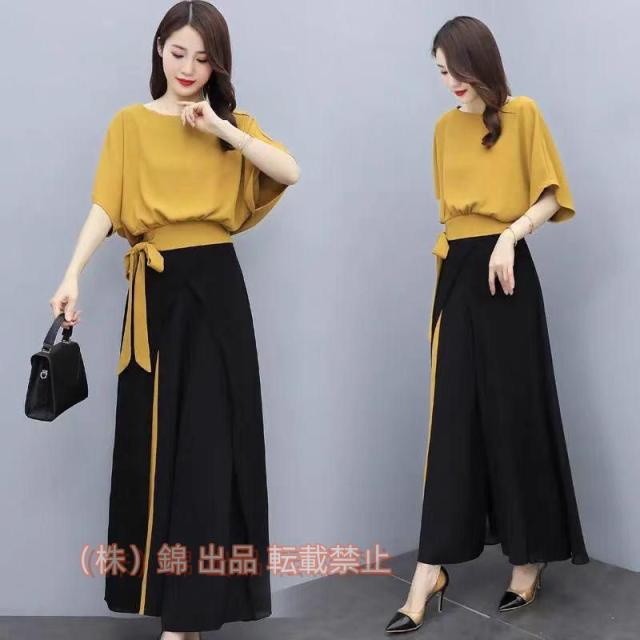 セットアップ レディース 夏 上下セット ワイドパンツ カットソー ブラウス 半袖 カジュアル 無地 リボン ガウチョパンツ 株式会社錦 体型カバー 着痩せ