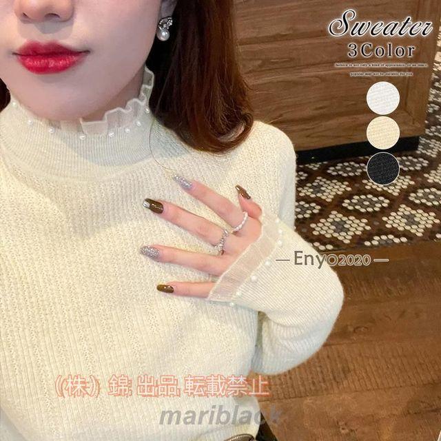 ニット フリルレースハイネック リブニットハイネックトップス ハイネック