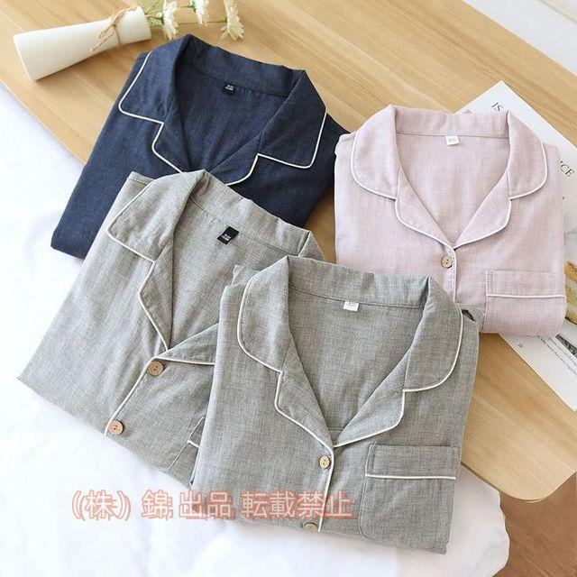 パジャマ レディース メンズ 長袖 パイピング かわいい ペアコーデ コーデ ガーゼ ルームウェア 株式会社錦おしゃれ 前開き 大きい 夫婦 カップル
