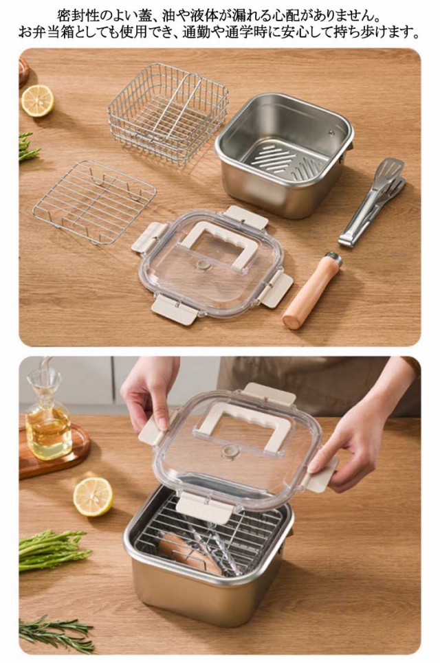 | コンパクトに収納できる天ぷら鍋セット♪ ハンドルは取り外し可能、揚げカゴ、油切り網、トングなど付属品は全て鍋に収納できるから、収納に困らず、キャンプなどアウトドア時携帯も便利です。 この小型ステンレス鍋は天ぷら鍋としてはもちろん、蒸鍋やお弁当箱としても使用可能です。 IH・ガス火対応なので、どんなキッチンでも活躍します。キャンプや通勤、運動会、通学時にも便利です。 密封性のよい蓋、油や液体が漏れる心配がありません。お弁当箱としても使用でき、通勤や通学時に安心して持ち歩けます。 | |