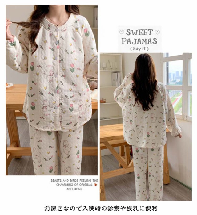 マタニティパジャマ 授乳服 上下セット ルームウェア キルト 中綿 マタニティウェア 長袖パジャマ ノーカラー 妊婦服 レディース 産前産後 肌に優しい 入院 女性 前開き 秋 冬