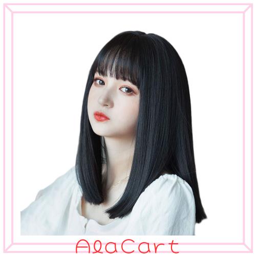 ◆商品名:ウィッグ ぱっつん 黒髪 セミロング ストレート シルクつむじ フルウィッグ ミディアム レディース かつら女装 ぱっつん前髪 小顔 耐熱
