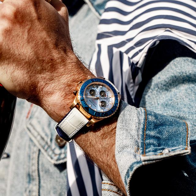 ソーラー駆動のクロノグラフムーブメントを搭載し、フル充電で約5ヵ月間駆動。電池交換の手間がかからず、日常使いにもぴったりです。ねじ込み式リューズと20気圧防水を備え、海辺のレジャーやアウトドアシーンでも頼れるタフな仕様。逆回転防止ベゼルにより、潜水時間の計測にも対応します。