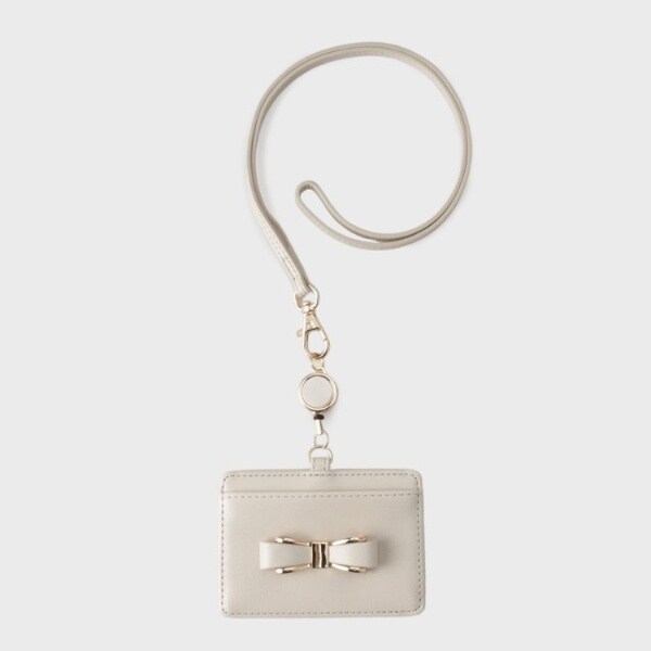 可愛らしいリボンモチーフが施されたリール付きパスケースは、機能性とデザイン性を両立。