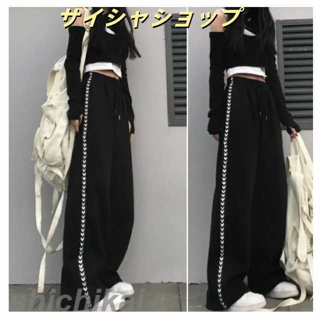 サイドVラインワイドパンツ ボトム スウェットパンツ ハーレムパンツ風 裾 ゴム入り 絞れる ブラック ダンス 練習着 ウエスト ゴム レディース 部屋着 長ズボン ロングパンツ 春夏 S/S 秋冬 A/W M L XL