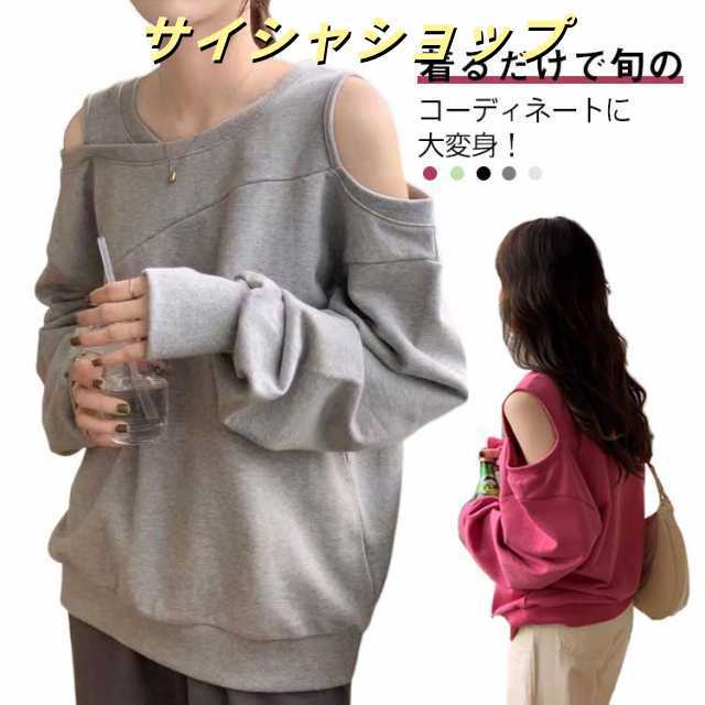 長袖 スウェット レディース トレーナー アシメ ラウンドネック トップス オフショルダー オフショルダー 肩出し ショルダーオープン 春 オフショル スウェット ゆったり カジュアル 無地 オーバーサイズ 韓国ファッション ホワイト ブラック ローズ グレー