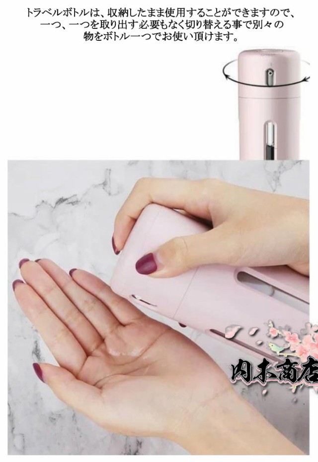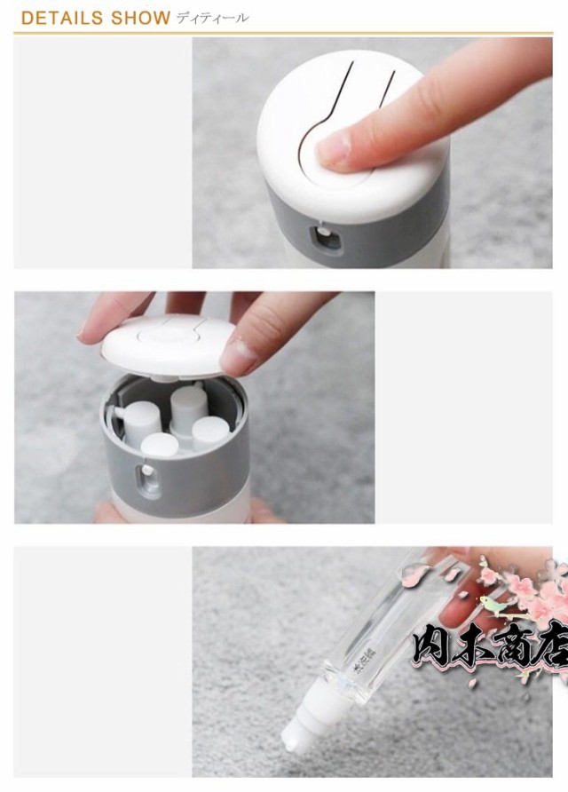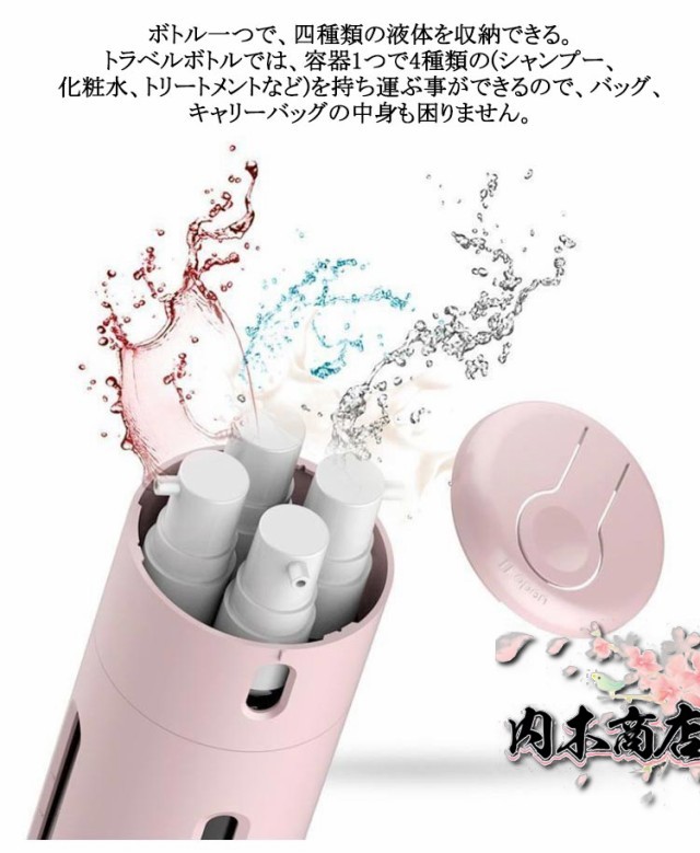 | 1日、2日の旅行、出張などに最適な便利グッズ トラベルボトルの中には四個の容器が内臓されているので、容器に別々の液体(シャンプー、化粧水,トリートメントなど)を収納することができます。 ボトル一つで、四種類の液体を収納できる。トラベルボトルでは、容器1つで4種類の(シャンプー、化粧水、トリートメントなど)を持ち運ぶ事ができるので、バッグ、キャリーバッグの中身も困りません。 トラベルボトルは、収納したまま使用することができますので、一つ、一つを取り出す必要もなく切り替える事で別々の物をボトル一つでお使い頂けます。 内部ボトルの容量が一目でわかるデザインとなっているので、容量を足したり、入れ替えを行うなどスムーズに行う事ができます。 | |