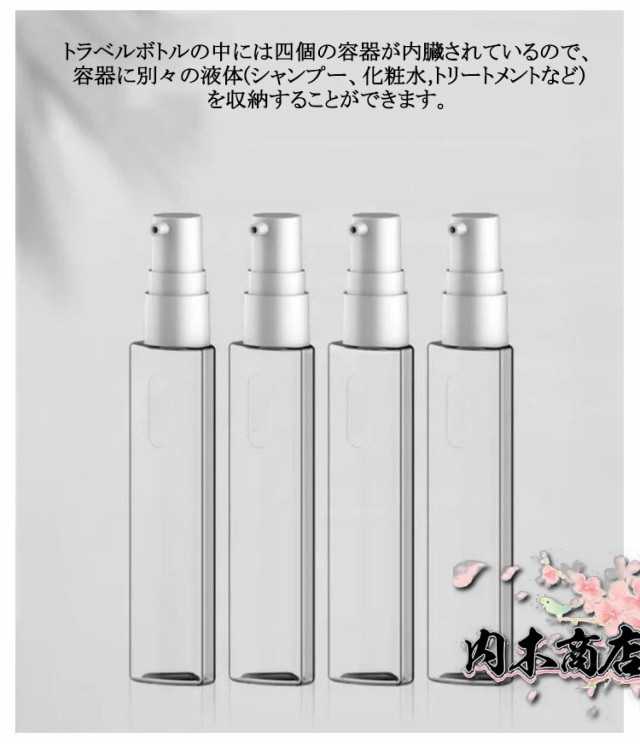 携帯 4in1 トラベルボトル 旅行用 化粧水 詰め替えボトル ボディソープ シャンプー 小分けボトル 小分け容器 おしゃれ 詰替容器 プール 持ち運び 旅行用 出張 温泉 ボトル トラベル 海水浴 ジム 液体用空ボトル 4in1 銭湯
