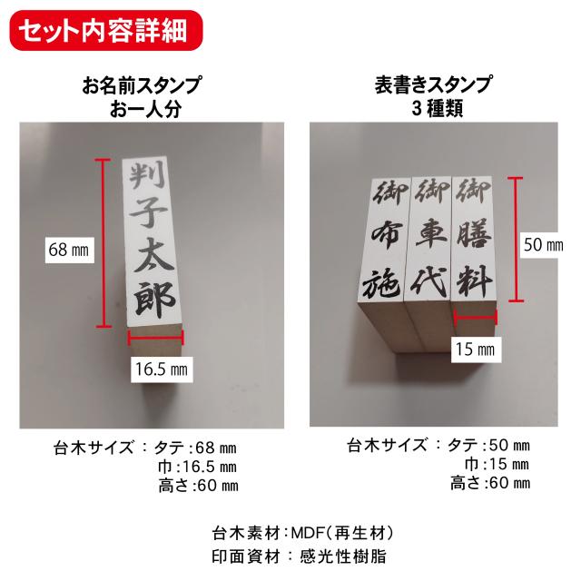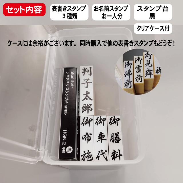 お名前スタンプお一人分と僧侶謝礼の代表的な表書き3個。御布施 御膳料 御車代の文字は固定です。