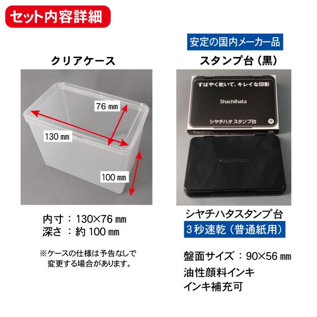 中身が上から見えるクリアケースに入れてお届けします。国内メーカー製の印影がきれいなスタンプパッド付。