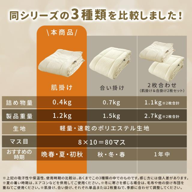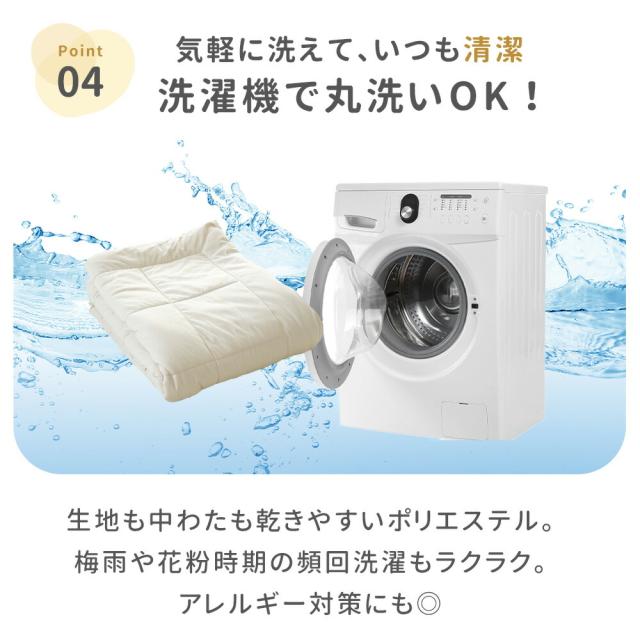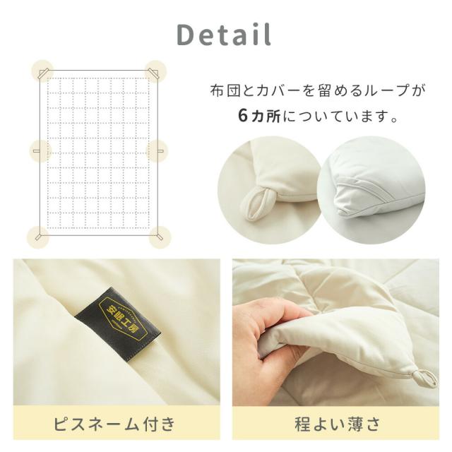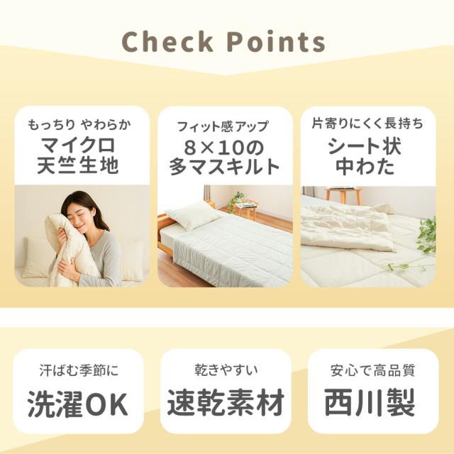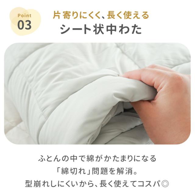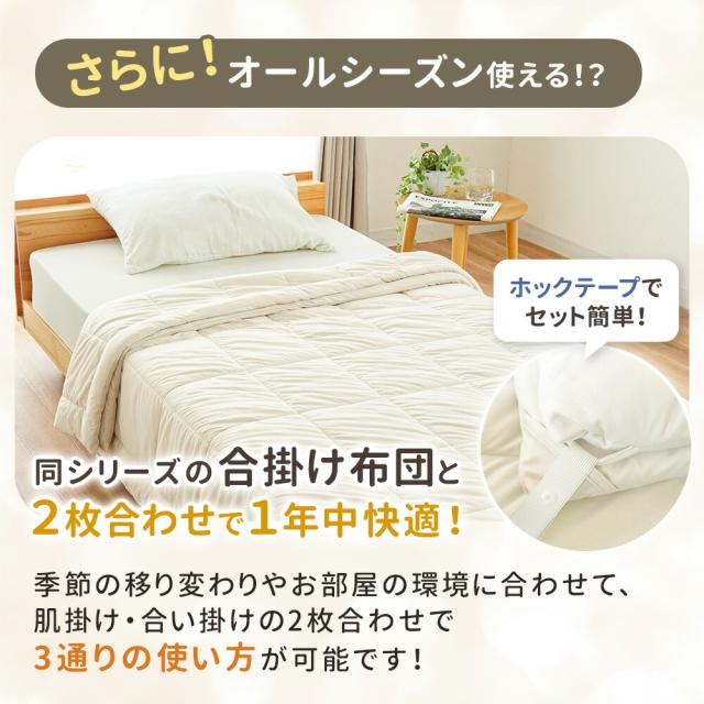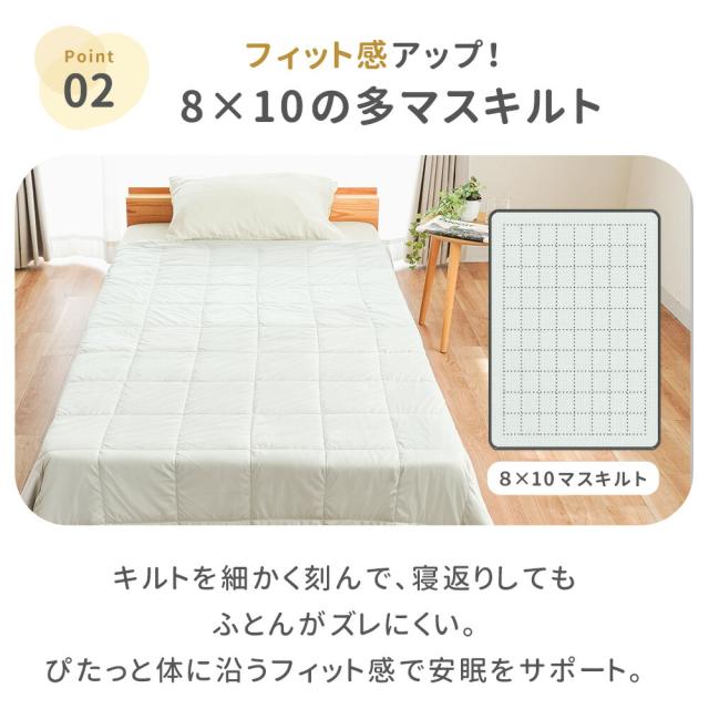 | ・「もっちりやわらか」マイクロ天竺生地 触れた瞬間にわかる伸びのあるしなやかさ。肌が“吸い付く”ような包まれ感で、就寝時間に癒しをプラス。 ・フィット感アップ!8×10の多マスキルトキルトを細かく刻んで、寝返りしてもふとんがズレにくい。ぴたっと体に沿うフィット感で安眠をサポート。 ・片寄りにくく、長く使えるシート状中わたふとんの中で綿がかたまりになる「綿切れ」問題を解消。型崩れしにくいから、長く使えてコスパ◎ ・気軽に洗えて、いつも清潔 洗濯機で丸洗いOK!生地も中わたも乾きやすいポリエステル。梅雨や花粉時期の頻回洗濯もラクラク。アレルギー対策にも◎ ・品質にもこだわりたい方へ 安心の西川製日本有数の寝具メーカー「西川」の製品です。創業450年以上、寝具を作ってきた故の信頼できる品質があります。 ・さらに!オールシーズン使える同シリーズの合掛け布団と2枚合わせて1年中快適! | |