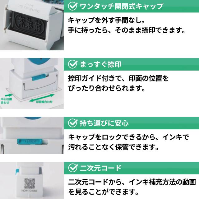 キャップレスなので、キャップを外す手間なく素早くなつ印できます。真っ直ぐに捺印できる捺印ガイド付きで、印鑑の位置合わせも簡単。持ち運びに安心なロック機能付きで、インクで書類やカバンの中が汚れる心配もありません。