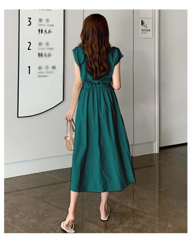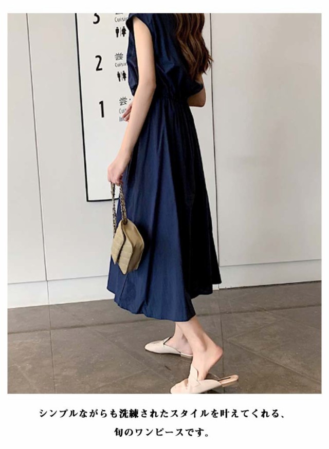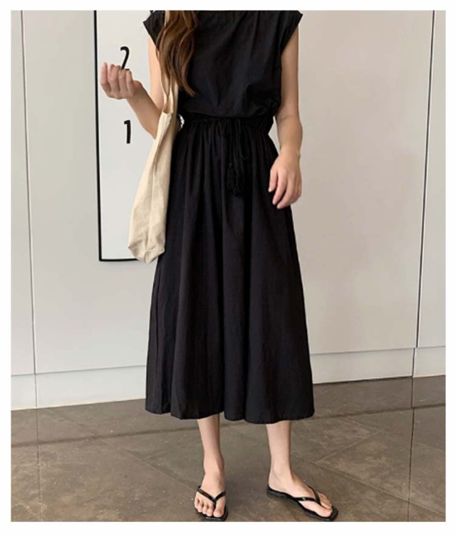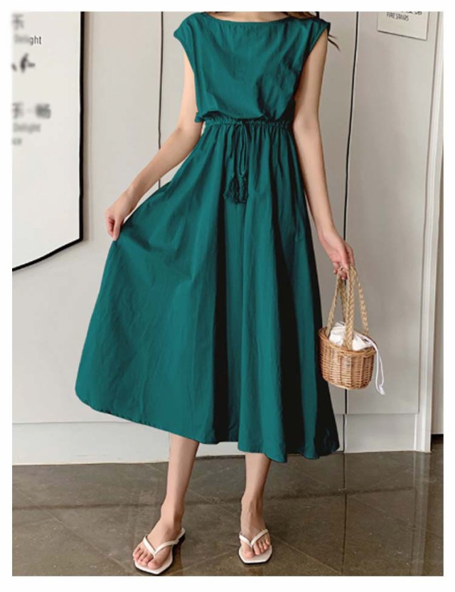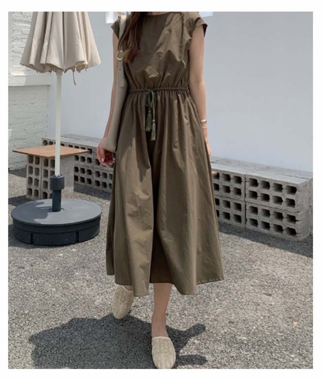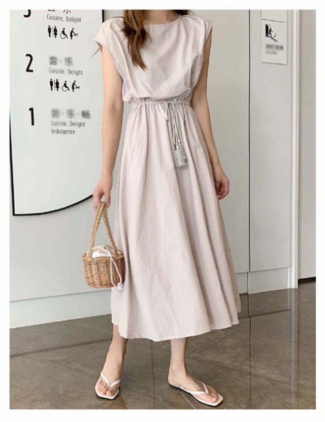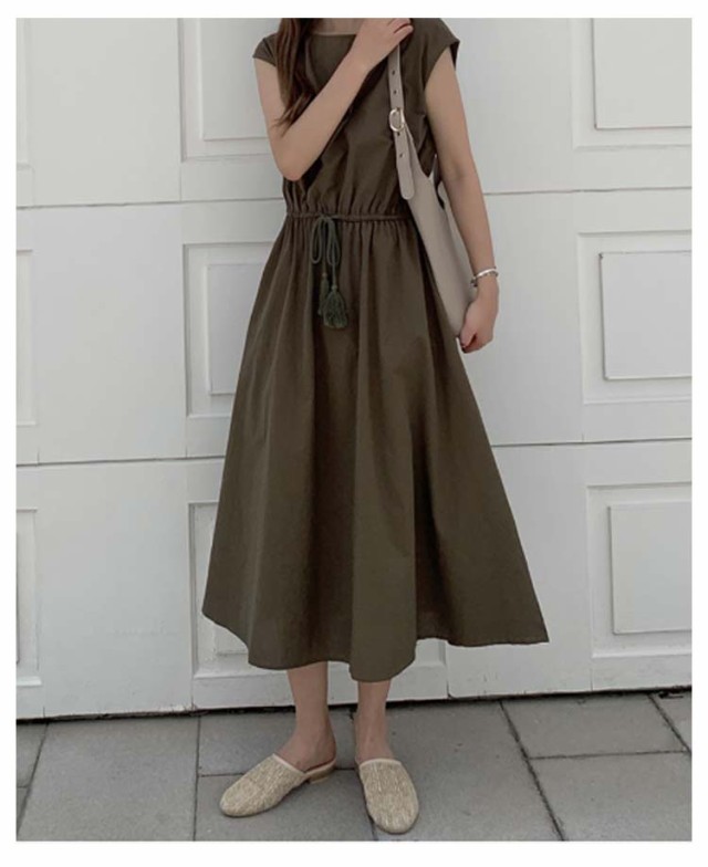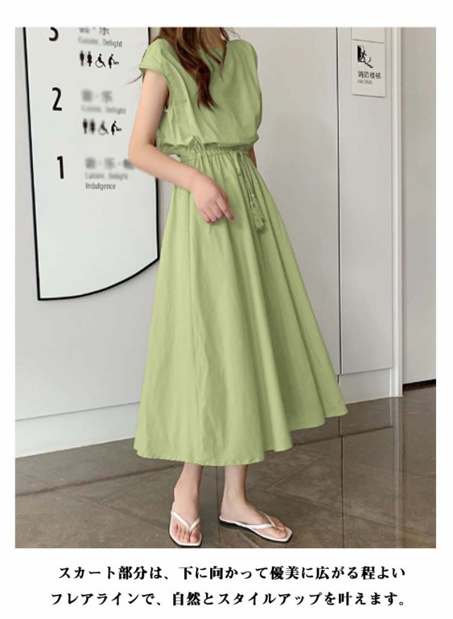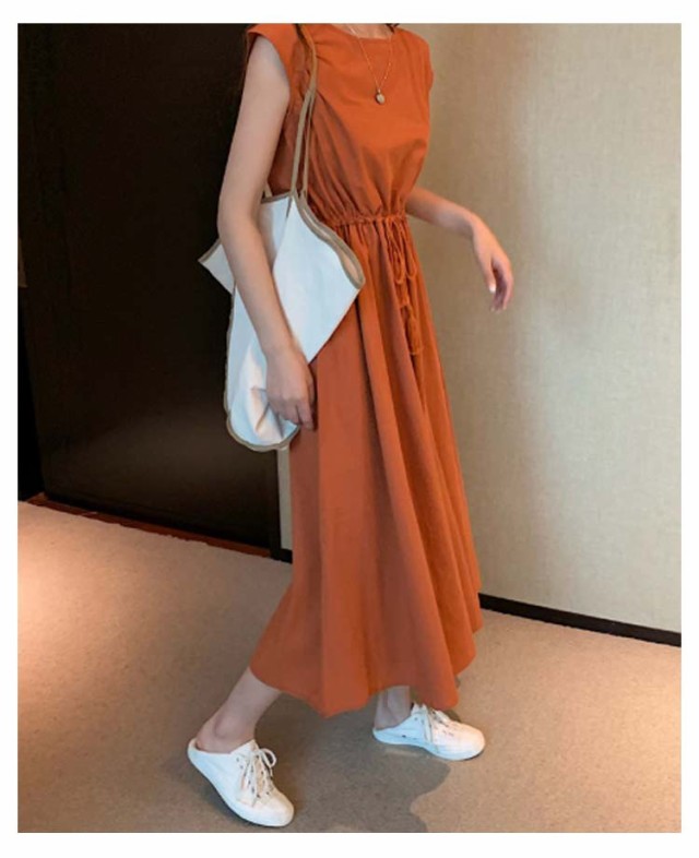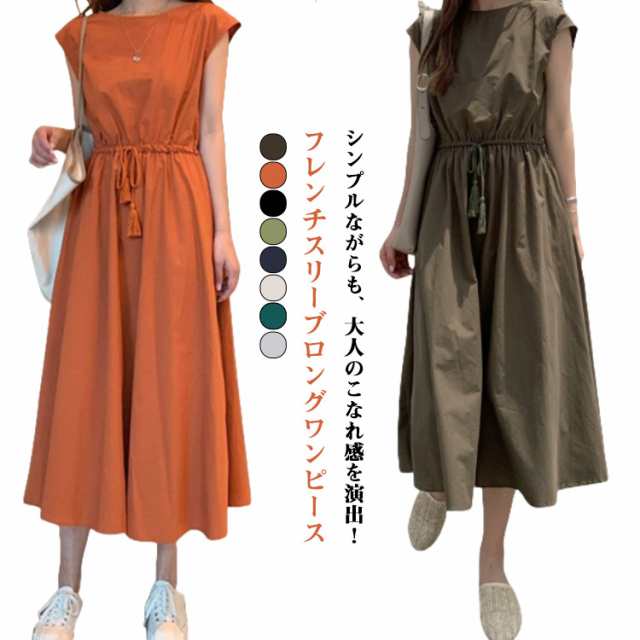ワンピース フレンチスリーブ ロングワンピース レディース 半袖 ロングワンピ 春 夏 Aラインワンピース ウエストゴム 着痩せ aライン 体型カバー 丸首 綿麻調ワンピース 白 ホワイト ブラック ベージュ オレンジ グリーン ネイビー 紺 リネン調ワンピース きれいめ 【送無】