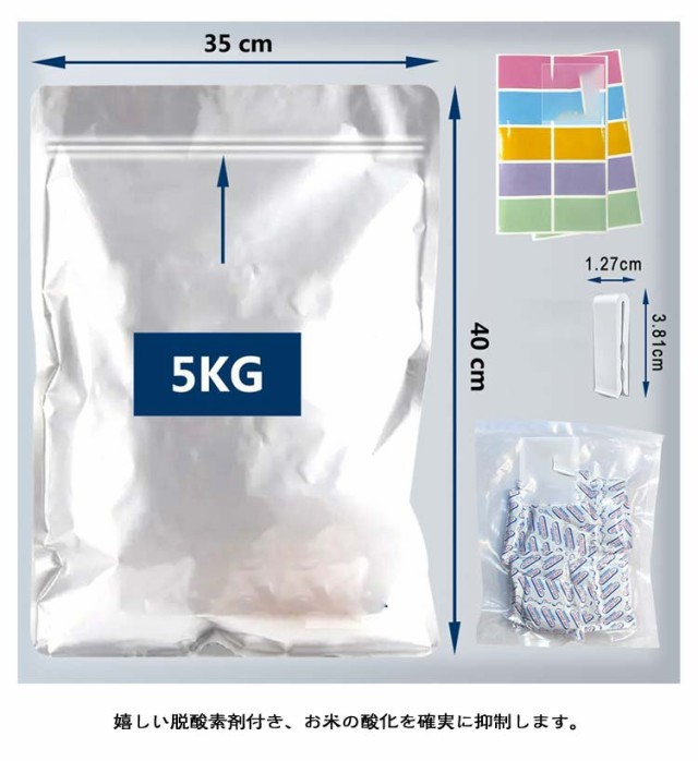 | サイズについての説明 | 5KG 35*40cm 10kg 40*50cm 23点セット内容:チャック付き袋10枚+脱酸素剤10個+ラベルシール2枚+スライダー1個 |