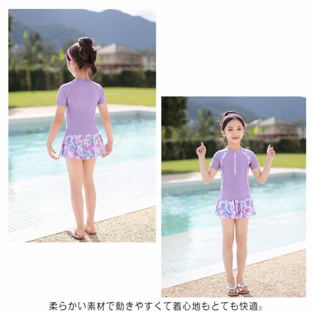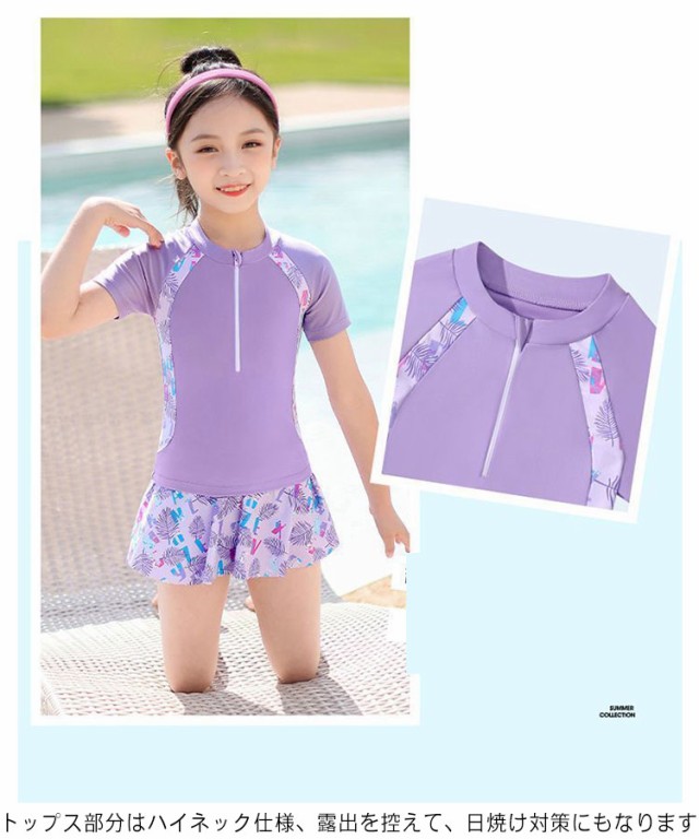 キッズ水着 女の子 セパレート 水着 スイムウェア 半袖 トップス+スカート インナーパンツ付き 2点セット ジュニア キッズ 子供 みずぎ 幼稚園 小学生 中学生 プール 海の リゾート 可愛い ボタニカル 100 110 120 130 140 150cm