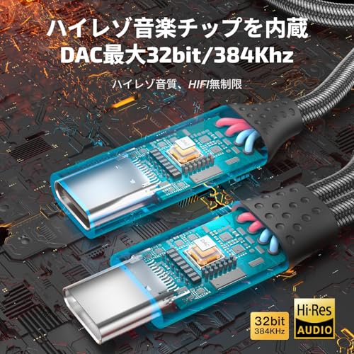 HiFi音質 - 32bit/384kHz - このUSB Cから3.5mmジャックへのアダプタと充電器は、32bit/384kHzのデジタル高解像度オーディオをサポートするDACオーディオデコーダーチップを内蔵しています。日本のHi-Resオーディオ認証を取得しており、ノイズキャンセリング機能を向上させ、音源のロスレス伝送を実現しています。高品質なHiFi音楽を提供することが可能です。また、ヘッドホンのボリューム調整(+/-)や再生/一時停止、リモートコントロールにも対応しています。