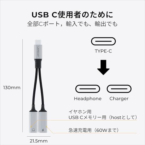 2in1PD60W高速充電&安全ータイプc充電器】2in1 タイプc イヤホン 変換アダプタは最大PD 60WのUSB C PD快速充電をサポートして、ラップトップにも。内蔵の高性能充電チップは、充電デバイスの電力に応じて充電電力を調整し、デバイスの寿命を最大限に保護します。充電しながらイヤホンも使用できます。注:ご使用になる充電器等の性能によって供給される電流値が異なります。