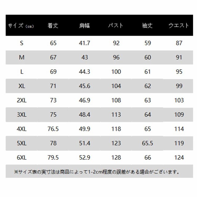 | サイズ | S M L XL 2XL 3XL 4XL 5XL 6XL |