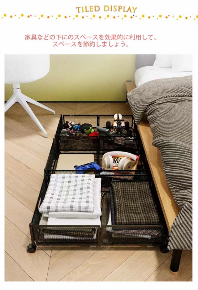 | キャスター付き、折りたたみ式ベッド下収納。 家具などの下にのスペースを効果的に利用して、スペースを節約しましょう。 使用しない時に折りたたんでコンパクトに収納することができて、収納のも楽々! 金属製で耐久性が高く、優れた性能を発揮します。 子供のおもちゃ、細かいもの、ベッドシーツや布団を収納することができます。 底部にはキャスターが付いており、引き出しも簡単、掃除や移動が楽になります。 ブラック&ホワイト、シンプルでおしゃれ、さまざまなシーンに適しています。 | |