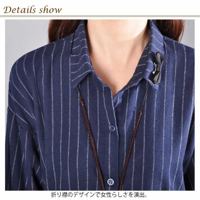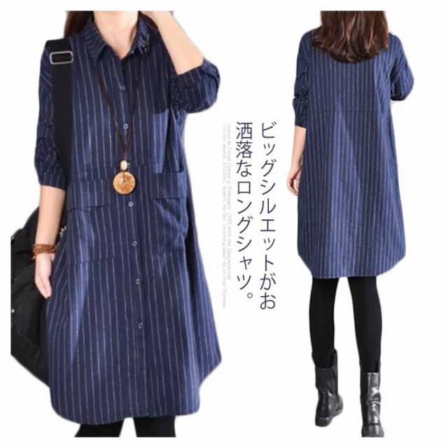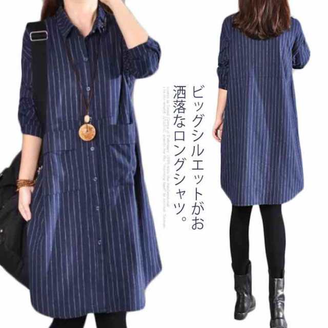 ロングシャツ トップス チュニック シャツ レディース ストライプ ロング丈 ボタン付き 前開き 大きいサイズ ゆったり 春服 春物 カジュアル お洒落 長袖送料無料