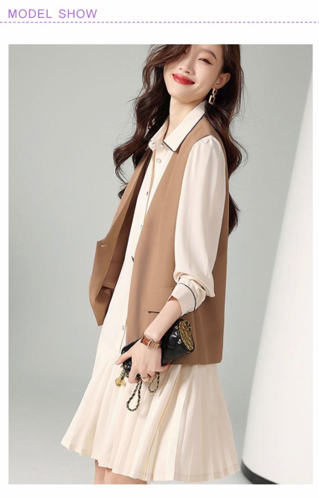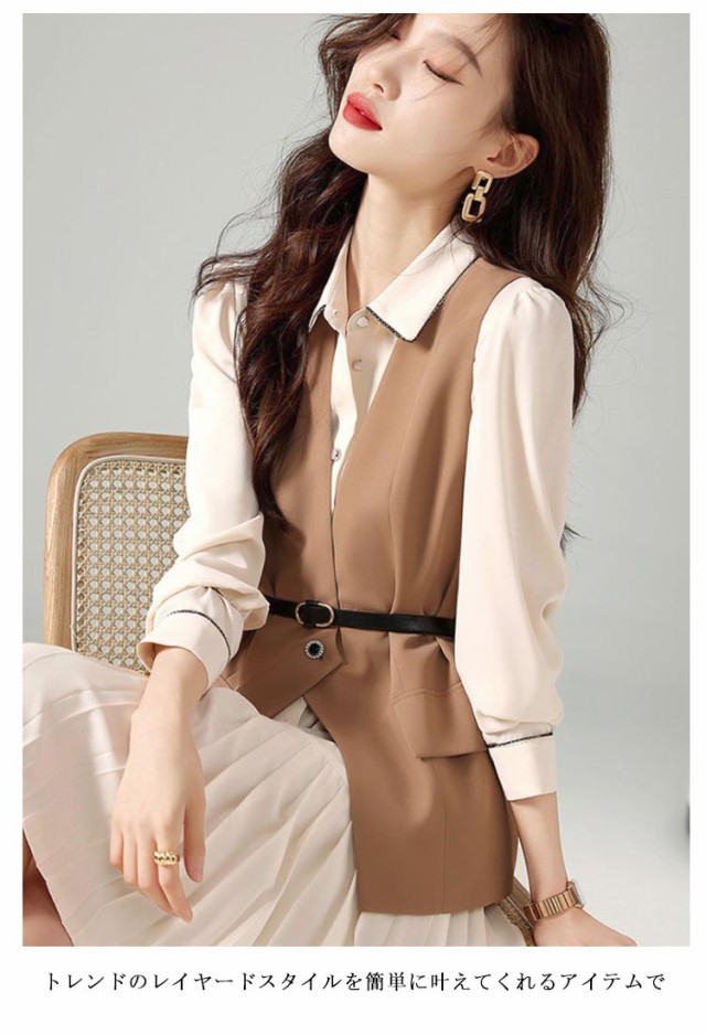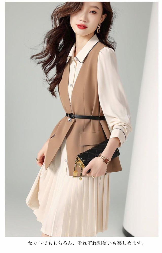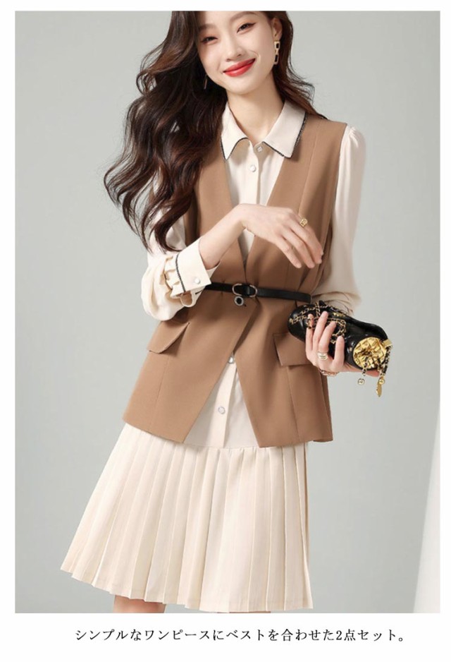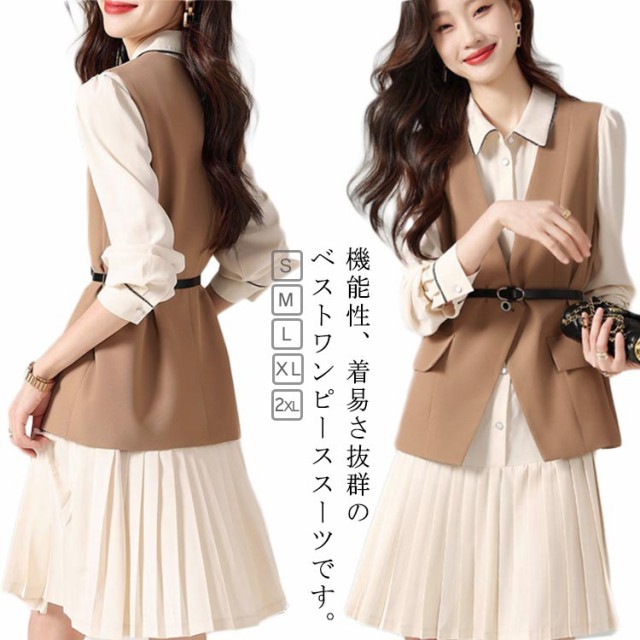さらりと心地よい 2点セット 秋 レディース レディース スカートスーツ 入学式 ワンピース レイヤード風 重ね着 オフィス 長袖 春 ジレ セットアップ 着痩せ フォーマル 膝丈 セレモニー カジュアル 結婚式 二次会 フォーマル 20代 30代 秋服 送料無料 通勤