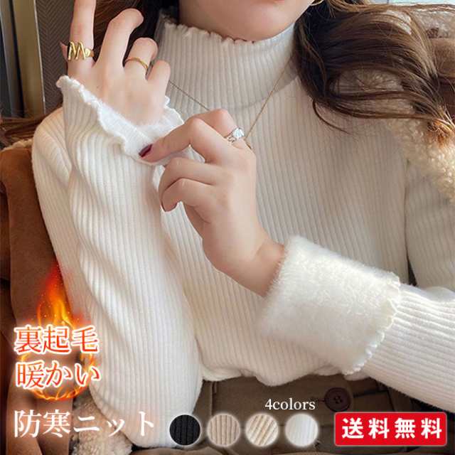 裏起毛 ニット トップス レディース フリルネック ミドルネック セーター モックネック 裏ボア 秋冬 長袖 オフィス カジュアル 暖か 防寒