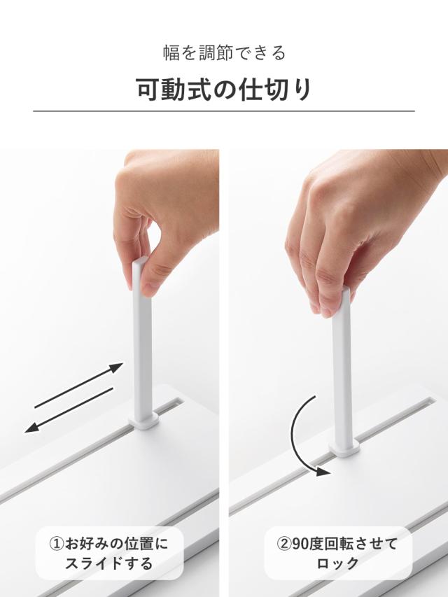 仕切りは収納物のサイズに合わせて調節できます。好みの位置にスライドしてロックするだけで、幅広い収納に使えます。