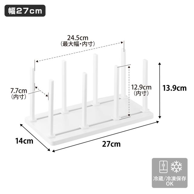 幅27cmで冷凍庫では縦にも横にも使えます。横並びに2台使用すればまとめてスッキリ整頓できます。